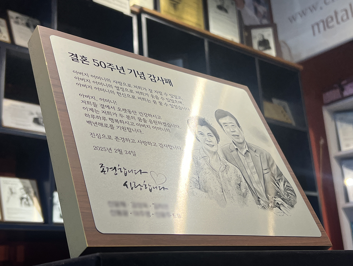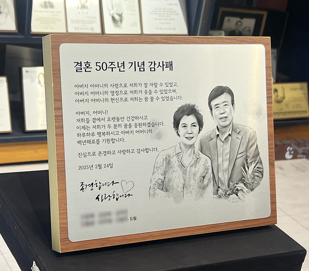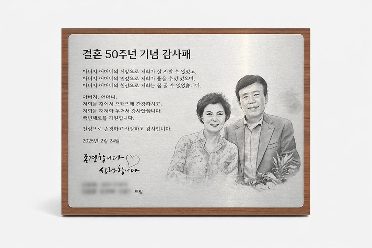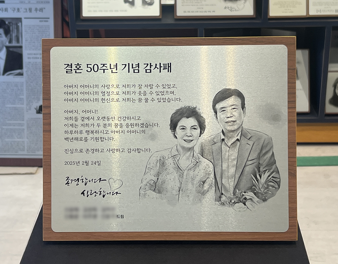 2호(24x30cm) 가로형으로 제작된 결혼 50주년 기념 감사패입니다.