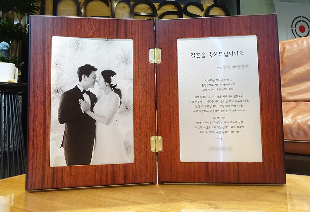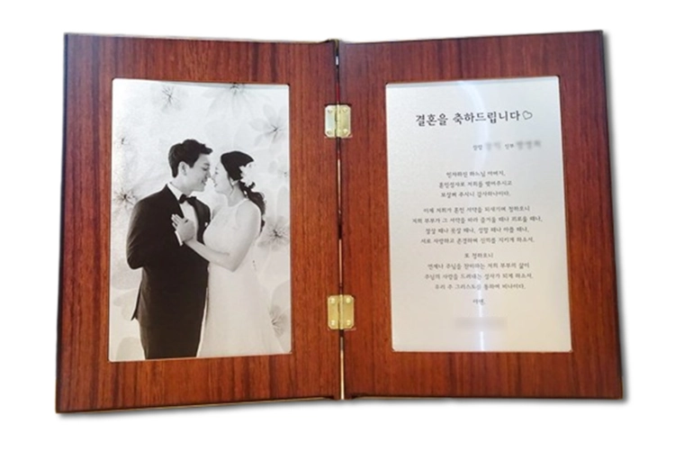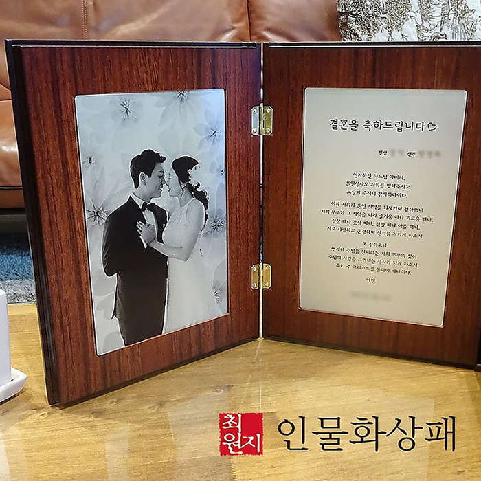 결혼식을 축하하며 제작한 접었다 폈다 할 수 있는 책패입니다. 인물화 작화 없이 흑백사진을 사용한 프리미엄포토상패입니다.