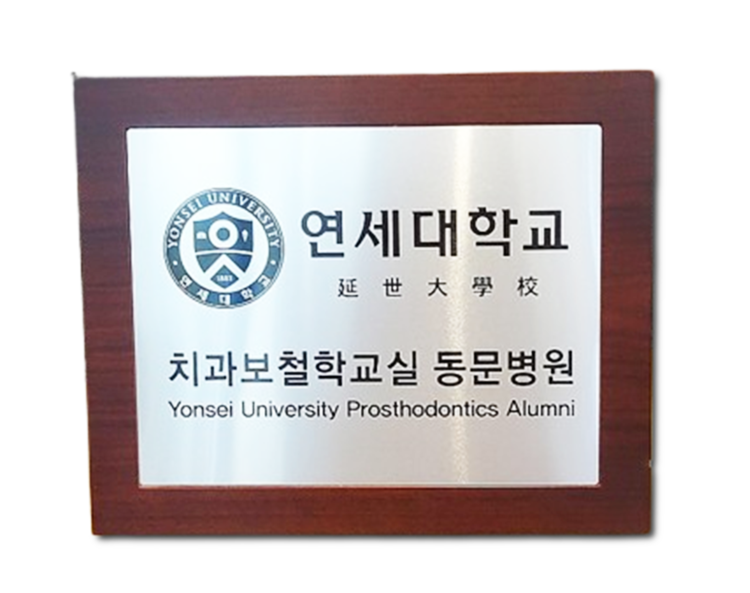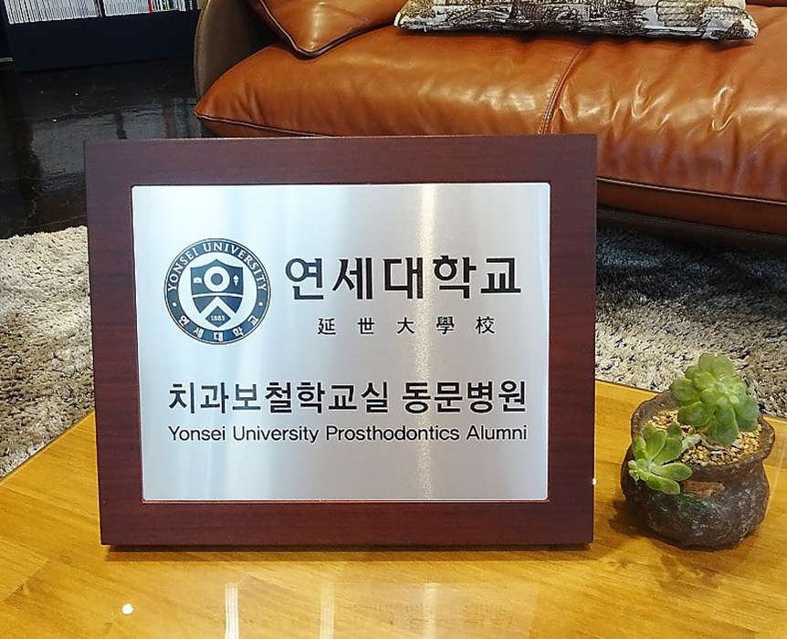 2호(24x30cm) 가로형으로 제작된 연세대학교 치과보철학교 동문병원 명판입니다.